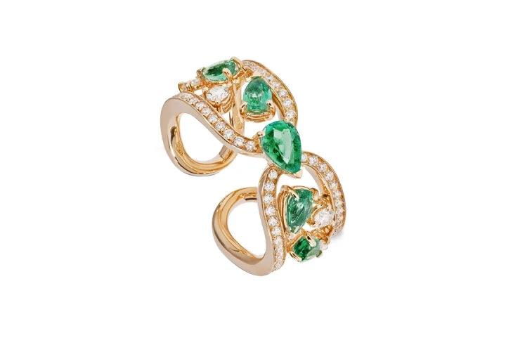 L’anello Noi in oro rosa e diamanti, rievoca un incontro romantico di linee preziose che si rincorrono unendo due anime innamorate.