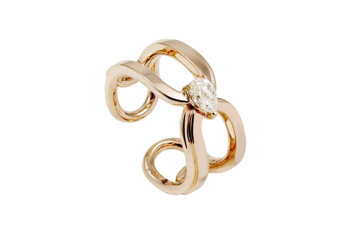 Il bracciale Clip in oro bianco con diamanti e zaffiri, ispirato ad una graffetta, simboleggia il primo passo di un’unione delicata e preziosa.